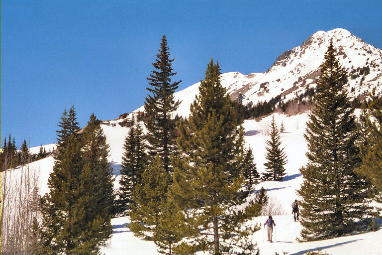 After a hearty breakfast at the Roosters Crow we headed up towards Cottonwood Pass to find the Denny Creek Trailhead. What we found was around thirty or so trucks with trailers and snowmobiles all over the place. They were having a blast roaring up the road to the pass which is closed for the winter. Nevertheless, we did find a parking space and got our gear on and headed up the trail. The snowmobiles were quickly forgotten as we headed up through the forest, around the bend, and entered the Collegiate Peaks Wilderness.
