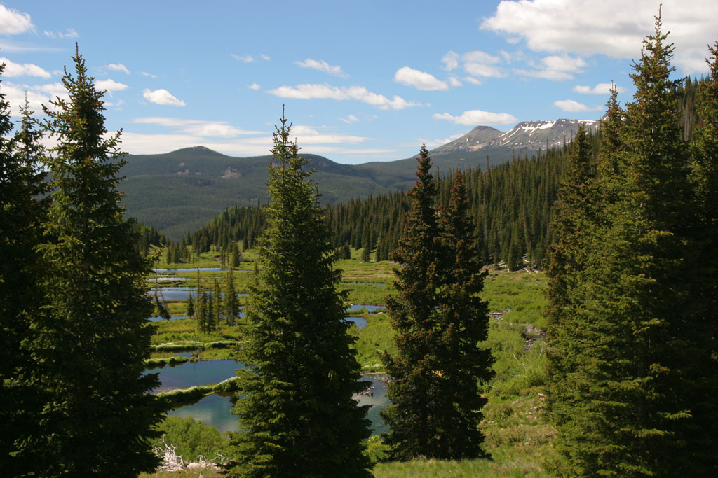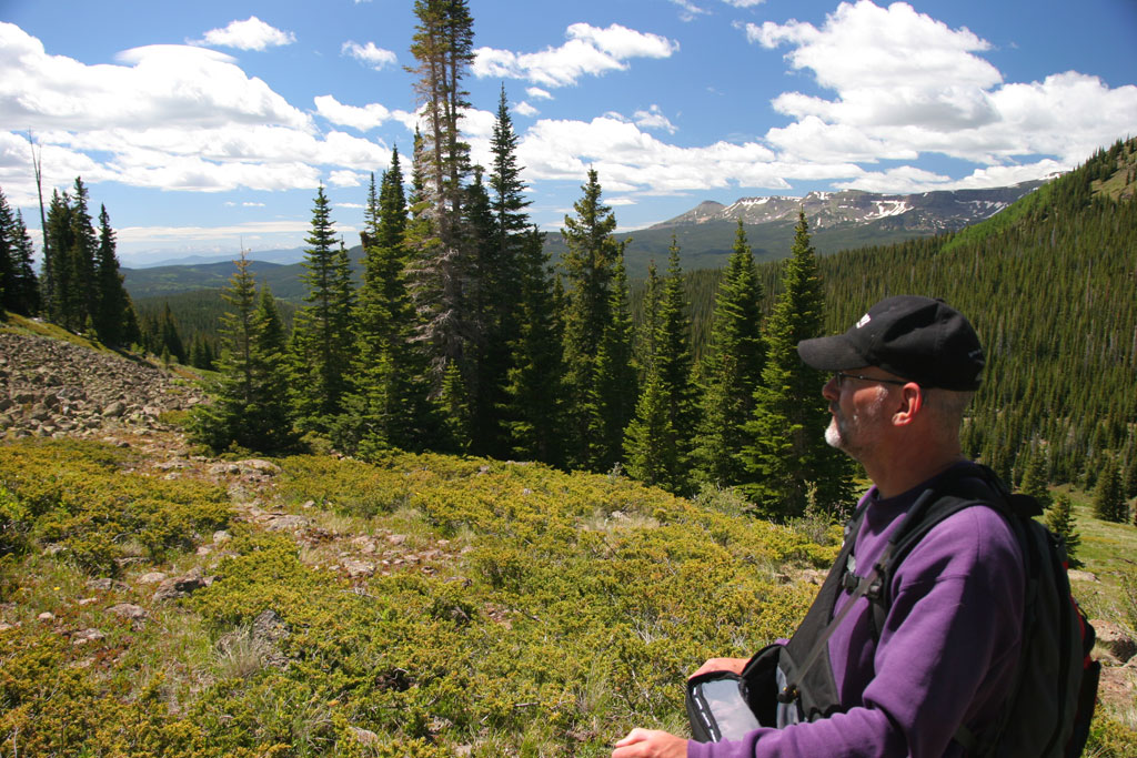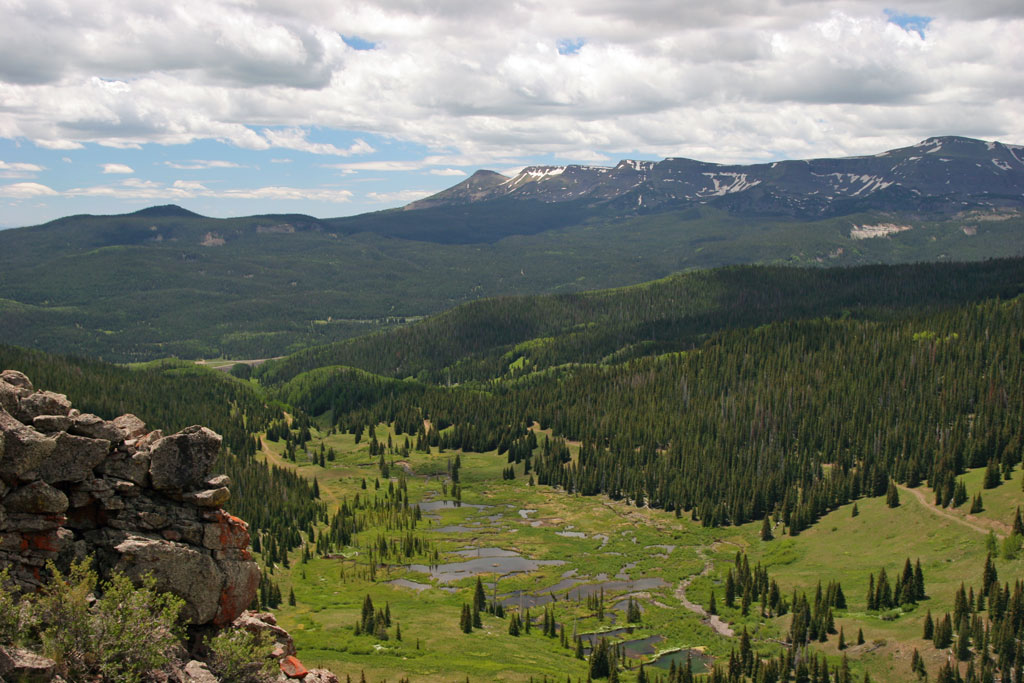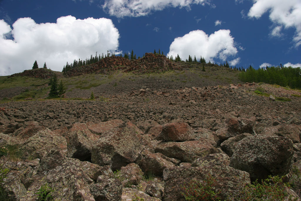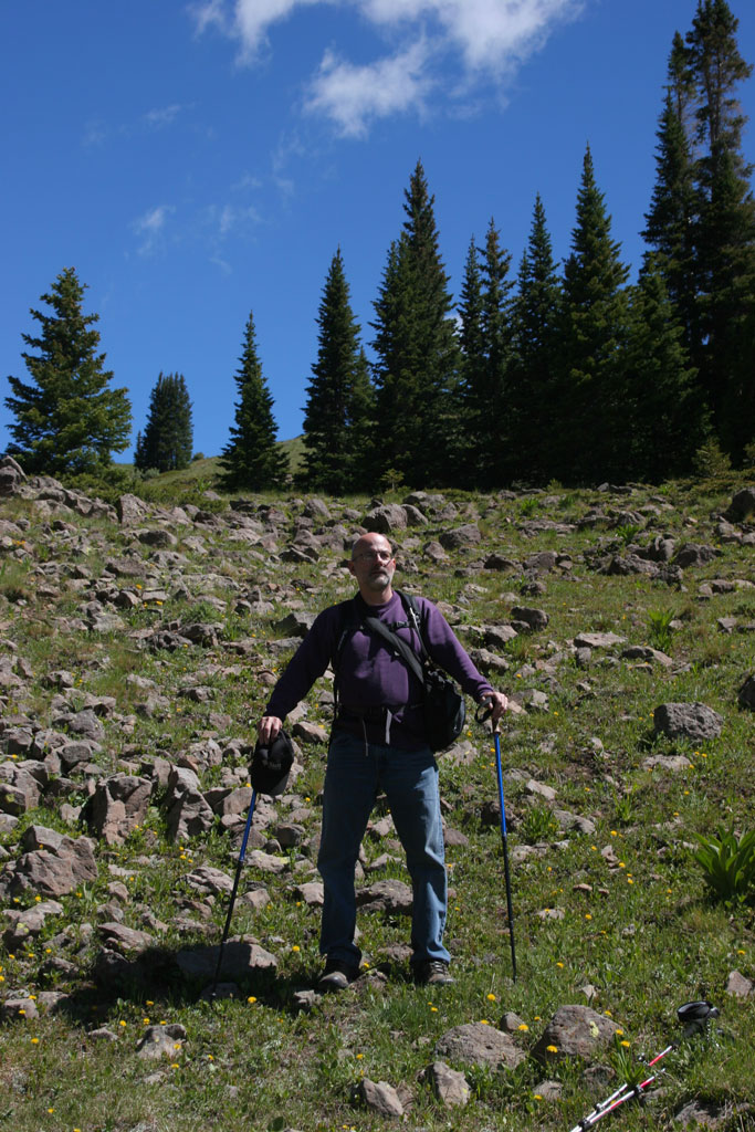It was an absolutely beautiful day to be hiking up in the alpine meadows. The weather was cool, sunny skies, and nice fluffy clouds. The trailhead is at 10,100 FT elevation and once we got started the trail quickly opened up into a splendid valley replete with many beaver ponds and wildflowers. The trail started off as an old road but soon disappeared underfoot and became somewhat difficult to follow. Eventually, we gave up and simply started following animal trails in the general direction we wanted to go. This took us away from the creek and we began to ascend the hill to the east. After some time it became apparent the trail was going to follow a diagonal up the slope towards a high rock outcropping.