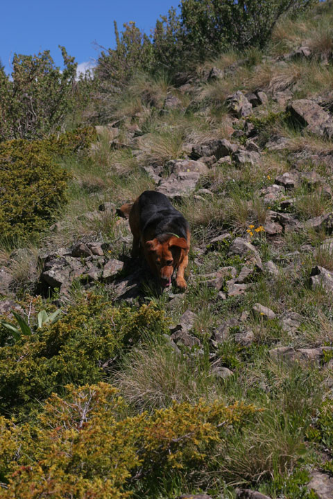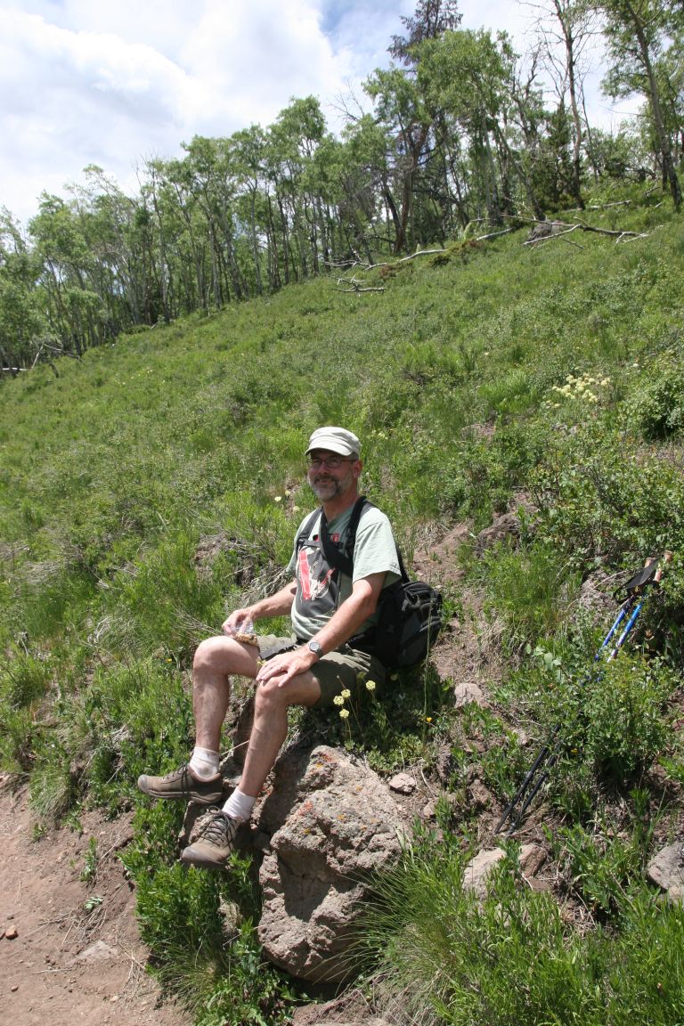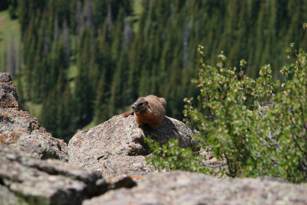 Hmm…decision point. We’ve already gone close to 2 miles and should probably head back. But that outcropping really isn’t that much higher and what a view from up there. Since we had our hiking poles we decided to make the extra effort and make the ascent. We ascended the hillside following the animal track and made it to the top (11,500 FT) where we found a greeting committee (Marmot)! The view was as anticipated…spectacular with the Flat Tops in the foreground and the Continental Divide visible in the background although a bit hazy. We had a spot of lunch while taking in the panorama and then an uneventful return. So, altogether around 4.5 miles…that is still more or less “short” isn’t it?