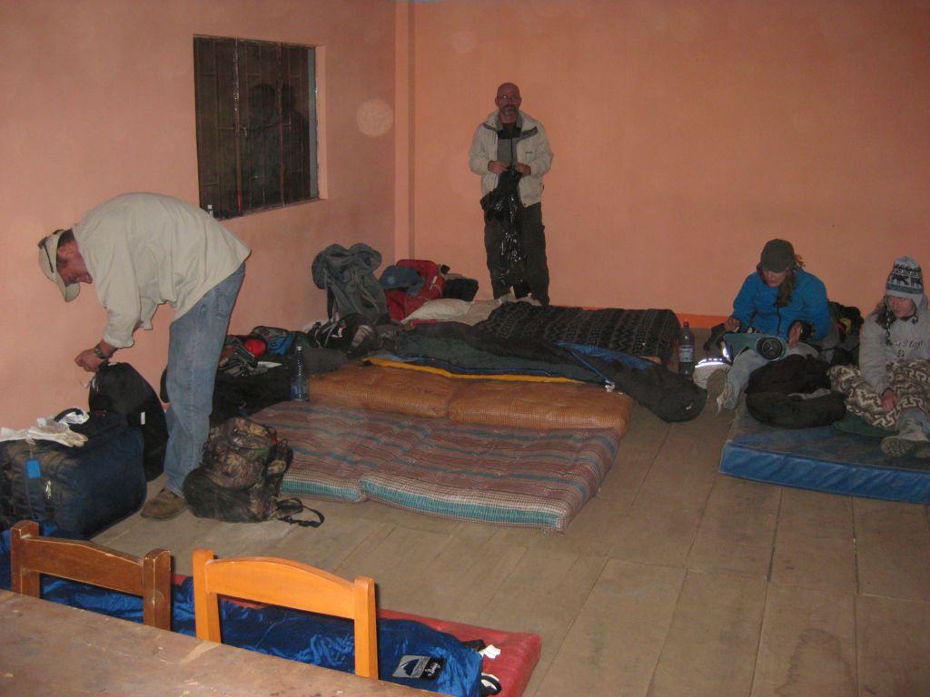 We discovered that is gets downright cold at night and that Wilson snores like a freight train! Sometime in the night, the light bulb that was taped to the wall let loose, swung across and exploded against the other wall, giving everyone quite a start.