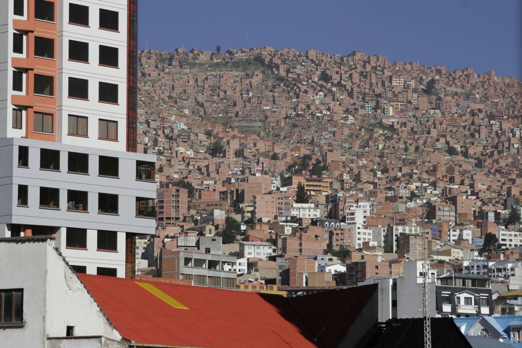 La Paz from our Hotel RoomMike and Ruben were waiting for us and we all piled into a bus and began an interesting journey down into the city center of La Paz. The airport is situated at the top of the city in the wide plain of the Altiplano. La Paz itself is spread throughout a very large and steep valley that declines some 1,000 meters. Dwellings are jam packed on the steep hillsides and into the mass and rush of a city of 1 million we are quickly swallowed.