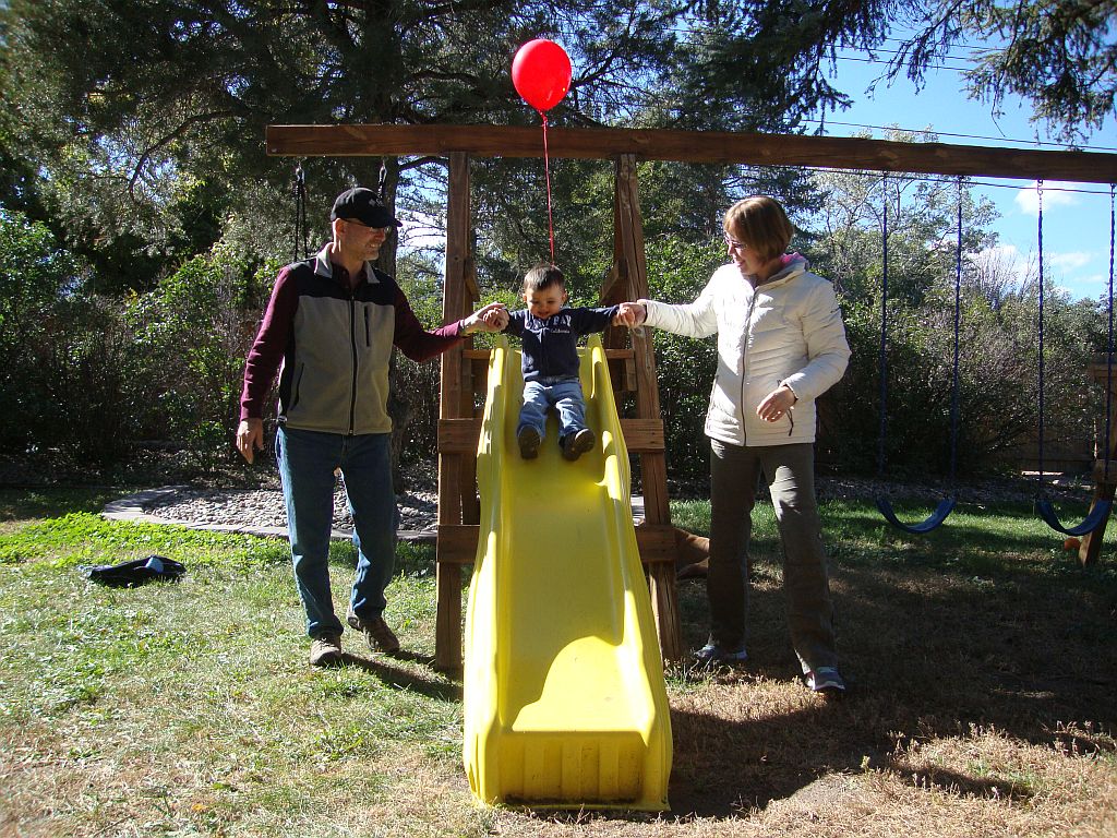 Josh and Selenda spent a beautiful Sunday with us for a simple early lunch, some needed catch up time and lots of Grands’ time. Selenda’s job balances on government contracts like Matt’s did previously and it makes for interesting conversation and not always the most solid future. Josh educated us about their 160 gallon salt water aquarium he built. They have so lovingly and painstakingly developed it together. It is truly gorgeous and mesmerizing to watch! This is a Youtube video of it with more fish and less coral than it has now but beautiful as it is. http://www.youtube.com/watch?v=tun6ZrkIDrM&feature=c4-overview&list=UUgwYXVMp36y_WTekn7Wn6Iw Josh is proud of being at home with the two boys and all that he can give to them! They are great parents! Matt and Selenda spent time helping the boys learn about how to slide on their swing set. It was fun to watch! He would get to the bottom, turn right around, grab the hands of his Mom and Grandpa, and go up the front and then, down again, repeatedly. He eventually he wore himself out and had to take time out for a nap. Then he showed us how he can drive his car now, played cars with us, and we built roads in the sand box. He is enjoying nursery school and making new friends.