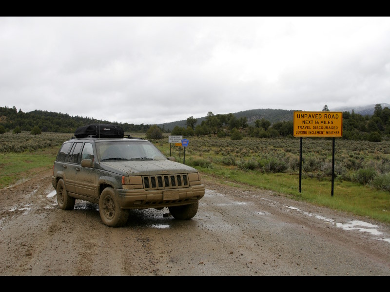 It took a little horsing around but out she came and I managed to get her turned around in the process headed back the way we came. Going back the other way was going to really change our plans but tackling another 13 miles of this muddy road just didn’t sound too smart. The other guy got himself unstuck about the same time and we both decided it made better sense to head back. We followed each other out and I stopped when we got back to the highway and took this picture.