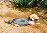 We looked for the connecting trail to St Mary’s Falls (SMF) but must of have missed it. After consulting the map I was pretty sure we needed to just make our own trail up the side of the hill and so we did. It was a rather steep ascent and we had to stop several times to catch our breath but sure enough at the top we found the trail coming along the ridge and just beginning to descend the other side. We followed it down to the streambed at the bottom and crossed over and picked up SMF trail. Abby was delighted to find the cold mountain stream and she laid down in it for a little bit to cool off and have a nice drink.